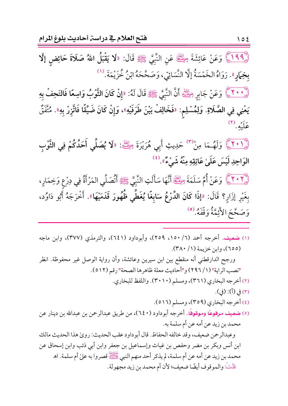 ٢٠٢ - وَعَنْ أُمِّ سَلَمَةَ -رضي الله عنها- أَنَّهَا سَأَلَتِ النَّبِيَّ - صلى الله عليه وسلم - أَتُصَلِّي المَرْأَةُ فِي دِرْعٍ وَخِمَارٍ، بِغَيْرِ إزَارٍ؟ قَالَ: «إذَا كَانَ الدِّرْعُ سَابِغًا يُغَطِّي ظُهُورَ قَدَمَيْهَا». أَخْرَجَهُ أَبُو دَاوُد، وَصَحَّحَ الأَئِمَّةُ وَقْفَهُ. (¬٥)