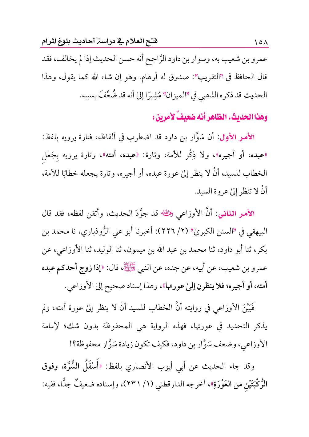 الأمر الثاني: أنَّ الأوزاعي -رحمه الله- قد جوَّدَ الحديث، وأتقن لفظه، فقد قال البيهقي في «السنن الكبرى» (٢/ ٢٢٦): أخبرنا أبو علي الرُّوذباري، نا محمد بن بكر، ثنا أبو داود، ثنا محمد بن عبد الله بن ميمون، ثنا الوليد، ثنا الأوزاعي، عن عمرو بن شعيب، عن أبيه، عن جده، عن النبي -صلى الله عليه وعلى آله وسلم-، قال: «إذا زوج أحدكم عبده أمته، أو أجيره؛ فلا ينظرن إلى عورتها»، وهذا إسناد صحيح إلى الأوزاعي.