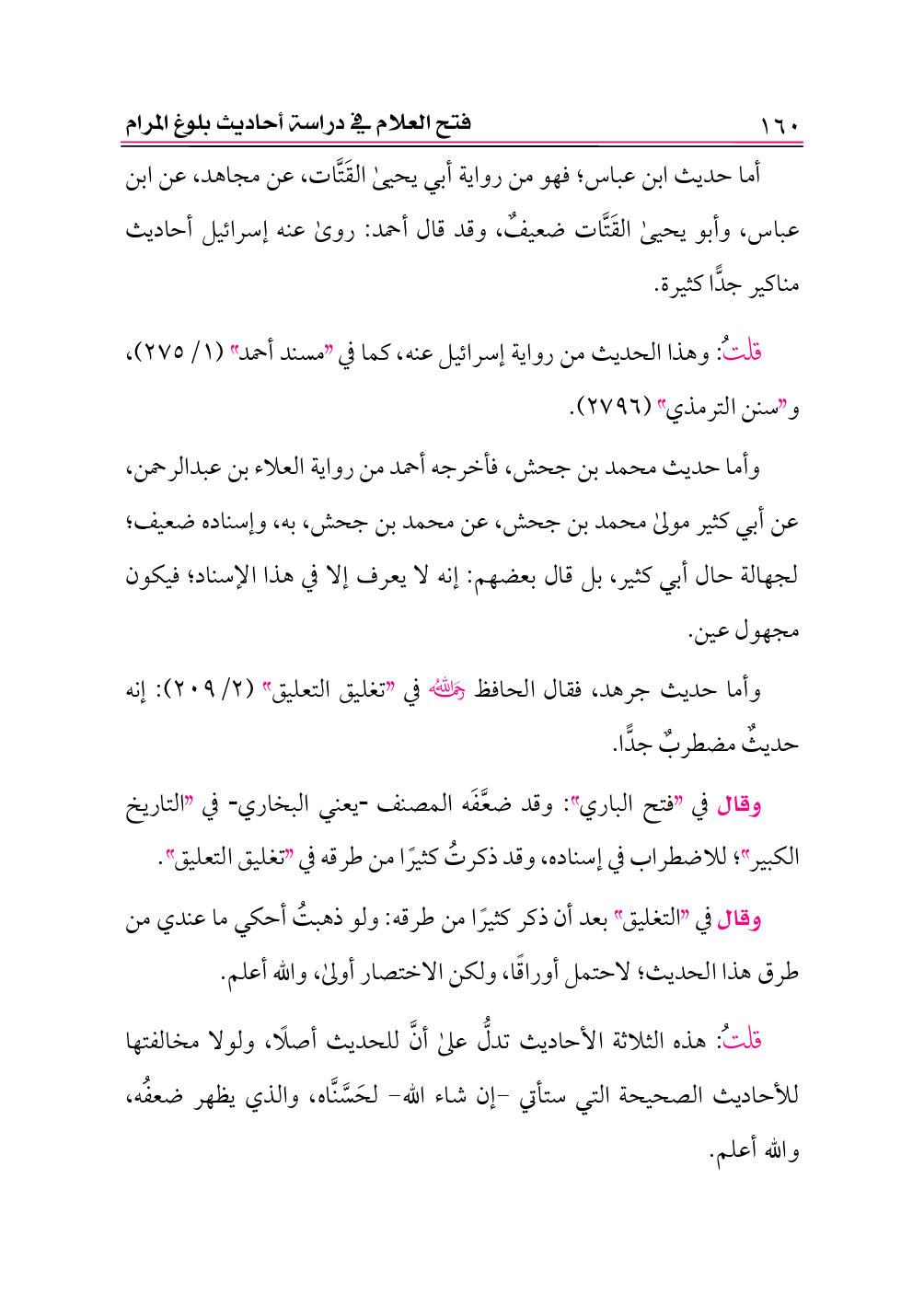 وقال في «فتح الباري»: وقد ضعَّفَه المصنف يعني البخاري في «التاريخ الكبير»؛ للاضطراب في إسناده، وقد ذكرتُ كثيرًا من طرقه في «تغليق التعليق».