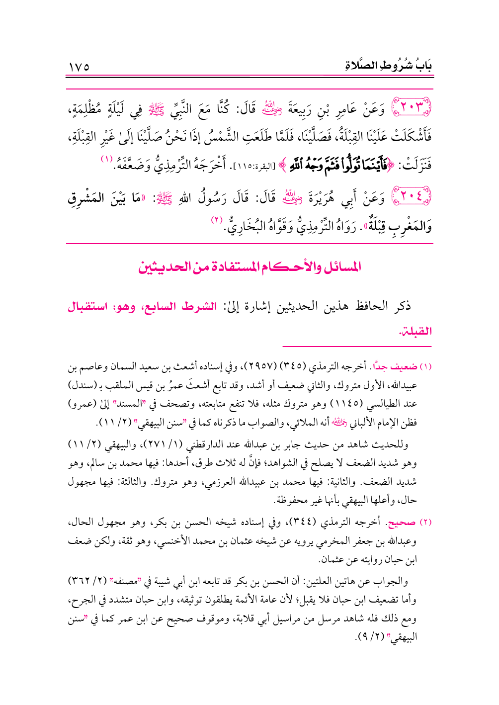 ٢٠٣ - وَعَنْ عَامِرِ بْنِ رَبِيعَةَ -رضي الله عنه- قَالَ: كُنَّا مَعَ النَّبِيِّ - صلى الله عليه وسلم - فِي لَيْلَةٍ مُظْلِمَةٍ، فَأَشْكَلَتْ عَلَيْنَا القِبْلَةُ، فَصَلَّيْنَا، فَلَمَّا طَلَعَتِ الشَّمْسُ إذَا نَحْنُ صَلَّيْنَا إلَى غَيْرِ القِبْلَةِ، فَنَزَلَتْ: {فَأَيْنَمَا تُوَلُّوا فَثَمَّ وَجْهُ اللَّهِ} [البقرة:١١٥]. أَخْرَجَهُ التِّرْمِذِيُّ وَضَعَّفَهُ. (¬١)