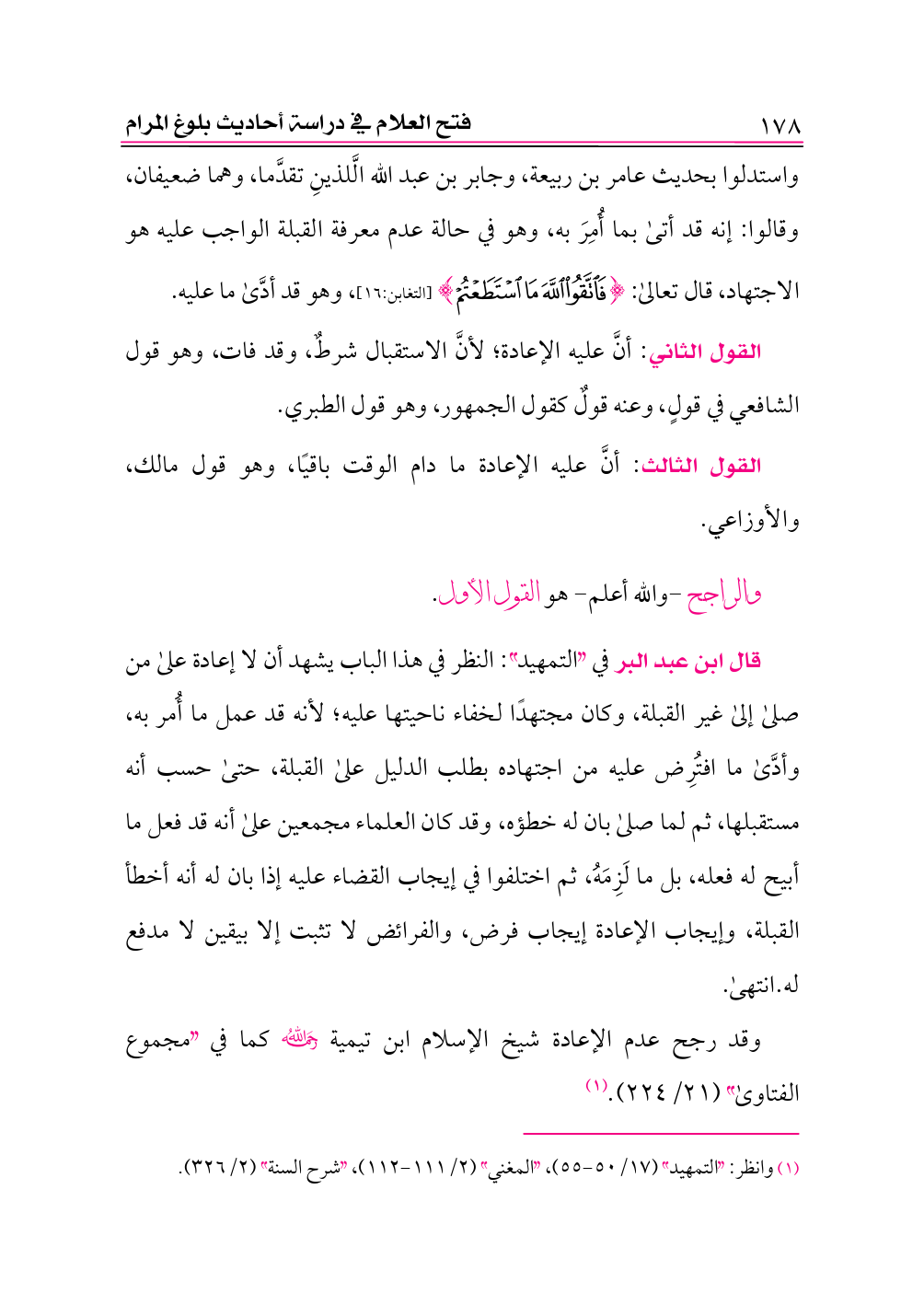 قال ابن عبد البر في «التمهيد»: النظر في هذا الباب يشهد أن لا إعادة على من صلى إلى غير القبلة، وكان مجتهدًا لخفاء ناحيتها عليه؛ لأنه قد عمل ما أُمر به، وأدَّى ما افتُرِض عليه من اجتهاده بطلب الدليل على القبلة، حتى حسب أنه مستقبلها، ثم لما صلى بان له خطؤه، وقد كان العلماء مجمعين على أنه قد فعل ما أبيح له فعله، بل ما لَزِمَهُ، ثم اختلفوا في إيجاب القضاء عليه إذا بان له أنه أخطأ القبلة، وإيجاب الإعادة إيجاب فرض، والفرائض لا تثبت إلا بيقين لا مدفع له. انتهى.