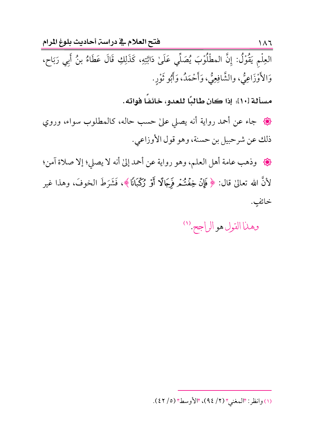• وذهب عامة أهل العلم، وهو رواية عن أحمد إلى أنه لا يصلي؛ إلا صلاة آمن؛ لأنَّ الله تعالى قال: {فَإِنْ خِفْتُمْ فَرِجَالًا أَوْ رُكْبَانًا}، فَشَرَطَ الخوفَ، وهذا غير خائفٍ.