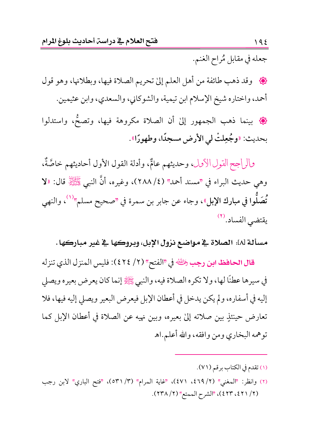 والراجح القول الأول، وحديثهم عامٌّ، وأدلة القول الأول أحاديثهم خاصَّةٌ، وهي حديث البراء في «مسند أحمد» (٤/ ٢٨٨)، وغيره، أنَّ النبي -صلى الله عليه وعلى آله وسلم- قال: «لا تُصَلُّوا في مبارك الإبل»، وجاء عن جابر بن سمرة في «صحيح مسلم» (¬١)، والنهي يقتضي الفساد. (¬٢)