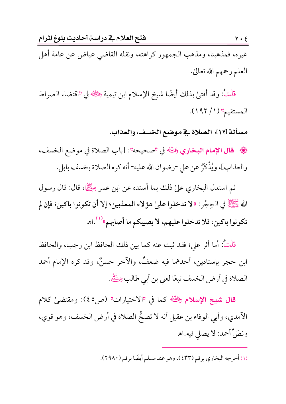 قال شيخ الإسلام -رحمه الله- كما في «الاختيارات» (ص ٤٥): ومقتضى كلام الآمدي، وأبي الوفاء بن عقيل أنه لا تصحُّ الصلاة في أرض الخسف، وهو قوي، ونصُّ أحمد: لا يصلي فيه. اهـ