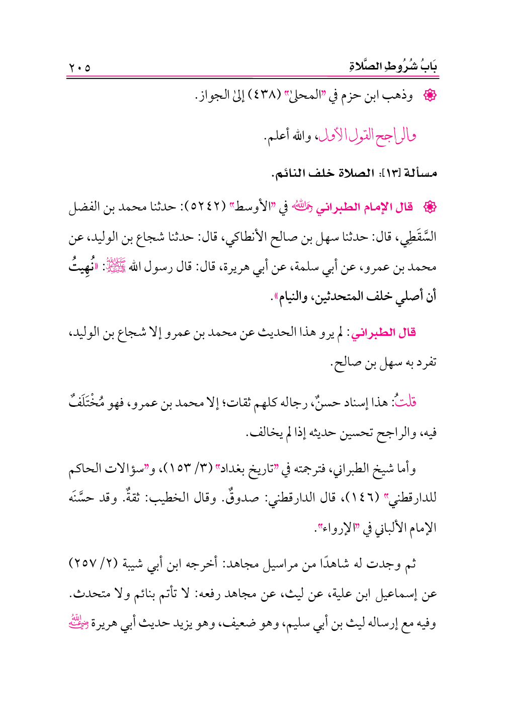 • قال الإمام الطبراني -رحمه الله- في «الأوسط» (٥٢٤٢): حدثنا محمد بن الفضل السَّقَطِي، قال: حدثنا سهل بن صالح الأنطاكي، قال: حدثنا شجاع بن الوليد، عن محمد بن عمرو، عن أبي سلمة، عن أبي هريرة، قال: قال رسول الله -صلى الله عليه وعلى آله وسلم-: «نُهِيتُ أن أصلي خلف المتحدثين، والنيام».