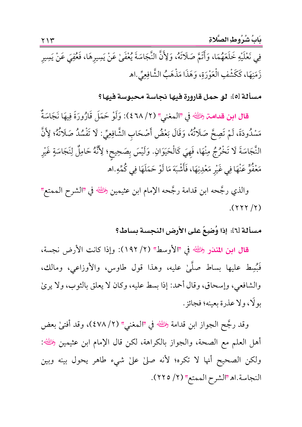 وقد رجَّح الجواز ابن قدامة -رحمه الله- في «المغني» (٢/ ٤٧٨)، وقد أفتى بعض أهل العلم مع الصحة، والجواز بالكراهة، لكن قال الإمام ابن عثيمين -رحمه الله-: ولكن الصحيح أنها لا تكره؛ لأنه صلى على شيء طاهر يحول بينه وبين النجاسة. اهـ «الشرح الممتع» (٢/ ٢٢٥).