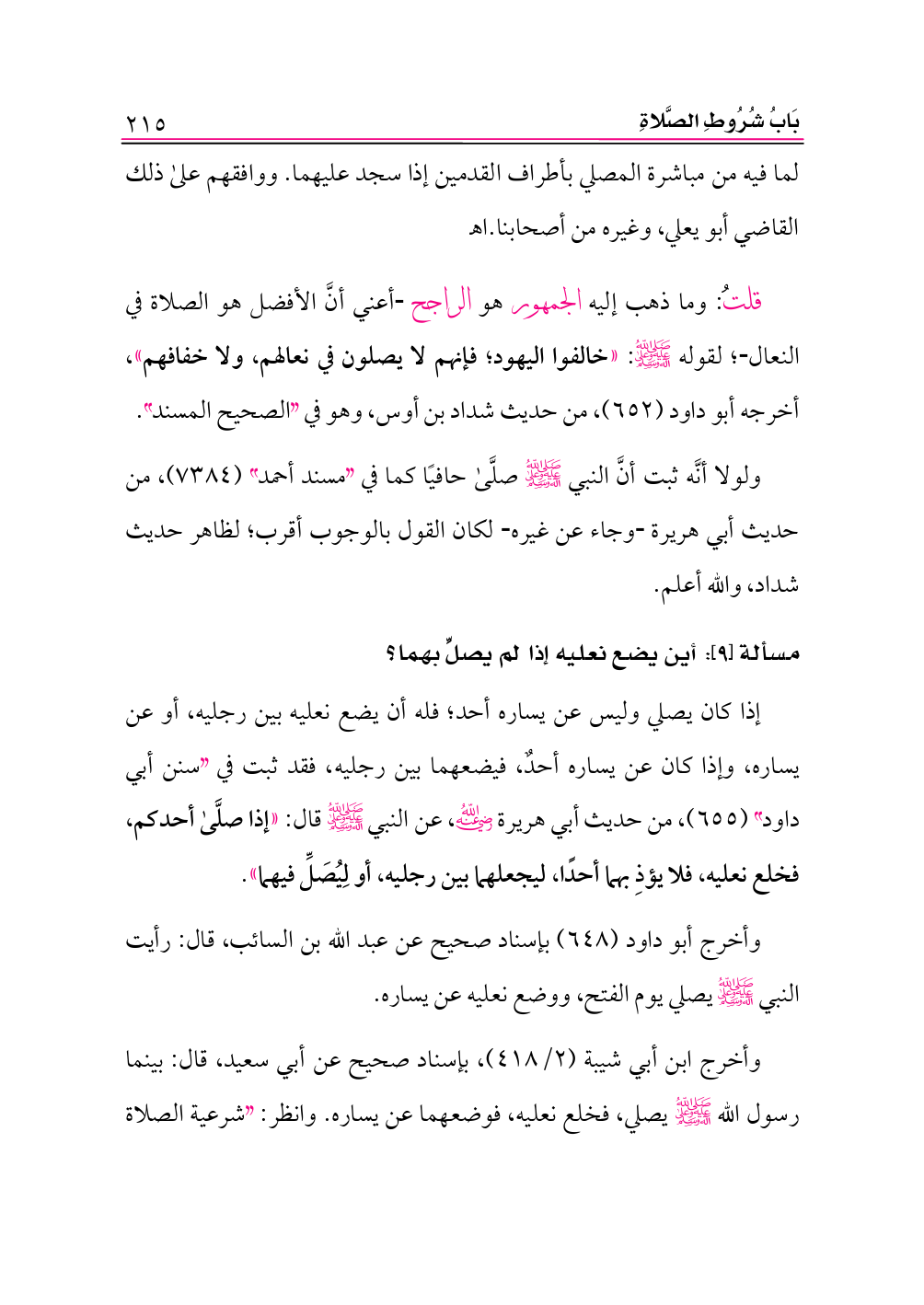 ولولا أنَّه ثبت أنَّ النبي -صلى الله عليه وعلى آله وسلم- صلَّى حافيًا كما في «مسند أحمد» (٧٣٨٤)، من حديث أبي هريرة وجاء عن غيره لكان القول بالوجوب أقرب؛ لظاهر حديث شداد، والله أعلم.