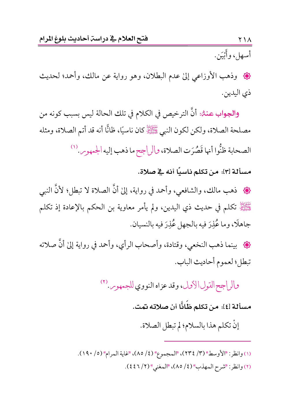 والجواب عنه: أنَّ الترخيص في الكلام في تلك الحالة ليس بسبب كونه من مصلحة الصلاة، ولكن لكون النبي -صلى الله عليه وعلى آله وسلم- كان ناسيًا، ظانًّا أنه قد أتم الصلاة، ومثله الصحابة ظنُّوا أنها قَصُرَت الصلاة، والراجح ما ذهب إليه الجمهور. (¬١)
