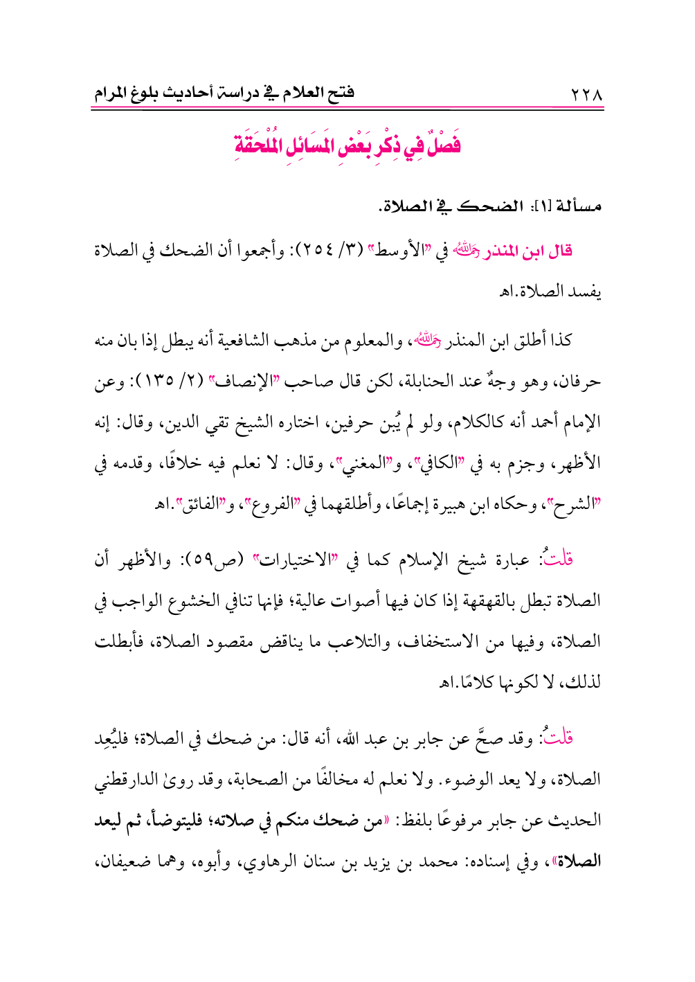 قلتُ: وقد صحَّ عن جابر بن عبد الله، أنه قال: من ضحك في الصلاة؛ فليُعِد الصلاة، ولا يعد الوضوء. ولا نعلم له مخالفًا من الصحابة، وقد روى الدارقطني الحديث عن جابر مرفوعًا بلفظ: «من ضحك منكم في صلاته؛ فليتوضأ، ثم ليعد الصلاة»، وفي إسناده: محمد بن يزيد بن سنان الرهاوي، وأبوه، وهما ضعيفان،