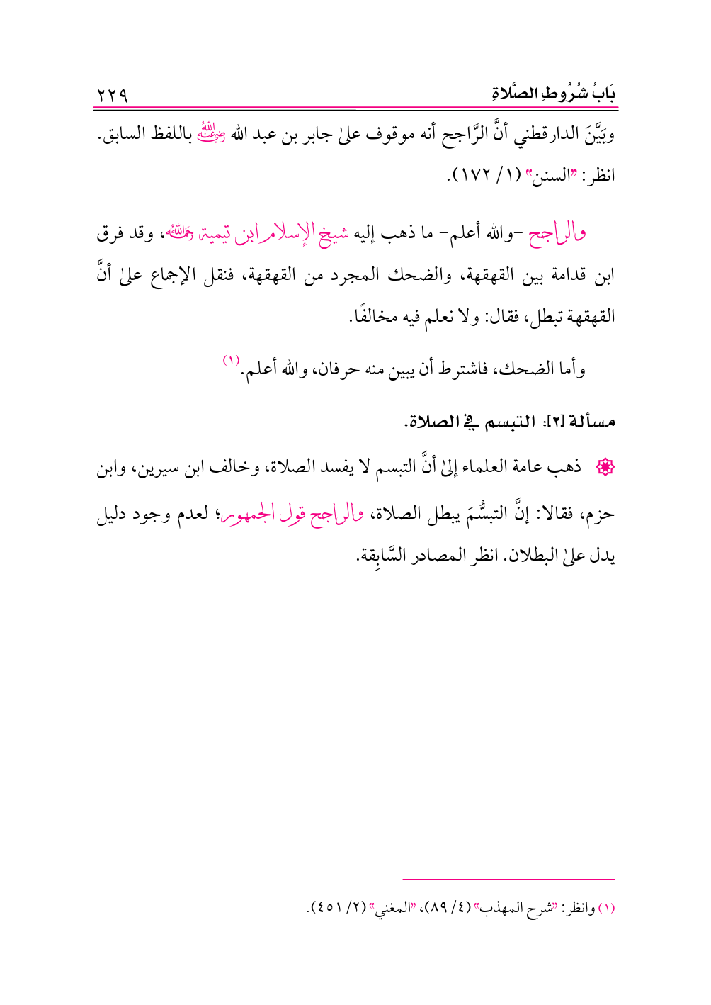 والراجح -والله أعلم- ما ذهب إليه شيخ الإسلام ابن تيمية -رحمه الله-، وقد فرق ابن قدامة بين القهقهة، والضحك المجرد من القهقهة، فنقل الإجماع على أنَّ القهقهة تبطل، فقال: ولا نعلم فيه مخالفًا.