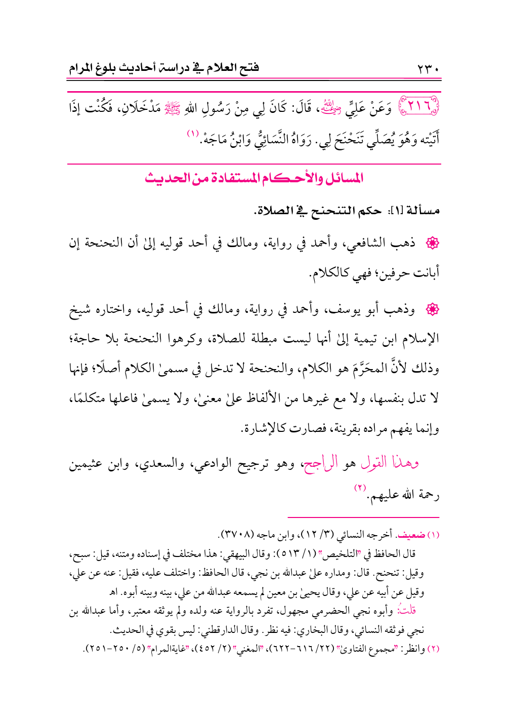 ٢١٦ - وَعَنْ عَلِيٍّ -رضي الله عنه-، قَالَ: كَانَ لِي مِنْ رَسُولِ اللهِ - صلى الله عليه وسلم - مَدْخَلَانِ، فَكُنْت إذَا أَتَيْته وَهُوَ يُصَلِّي تَنَحْنَحَ لِي. رَوَاهُ النَّسَائِيُّ وَابْنُ مَاجَهْ. (¬١)