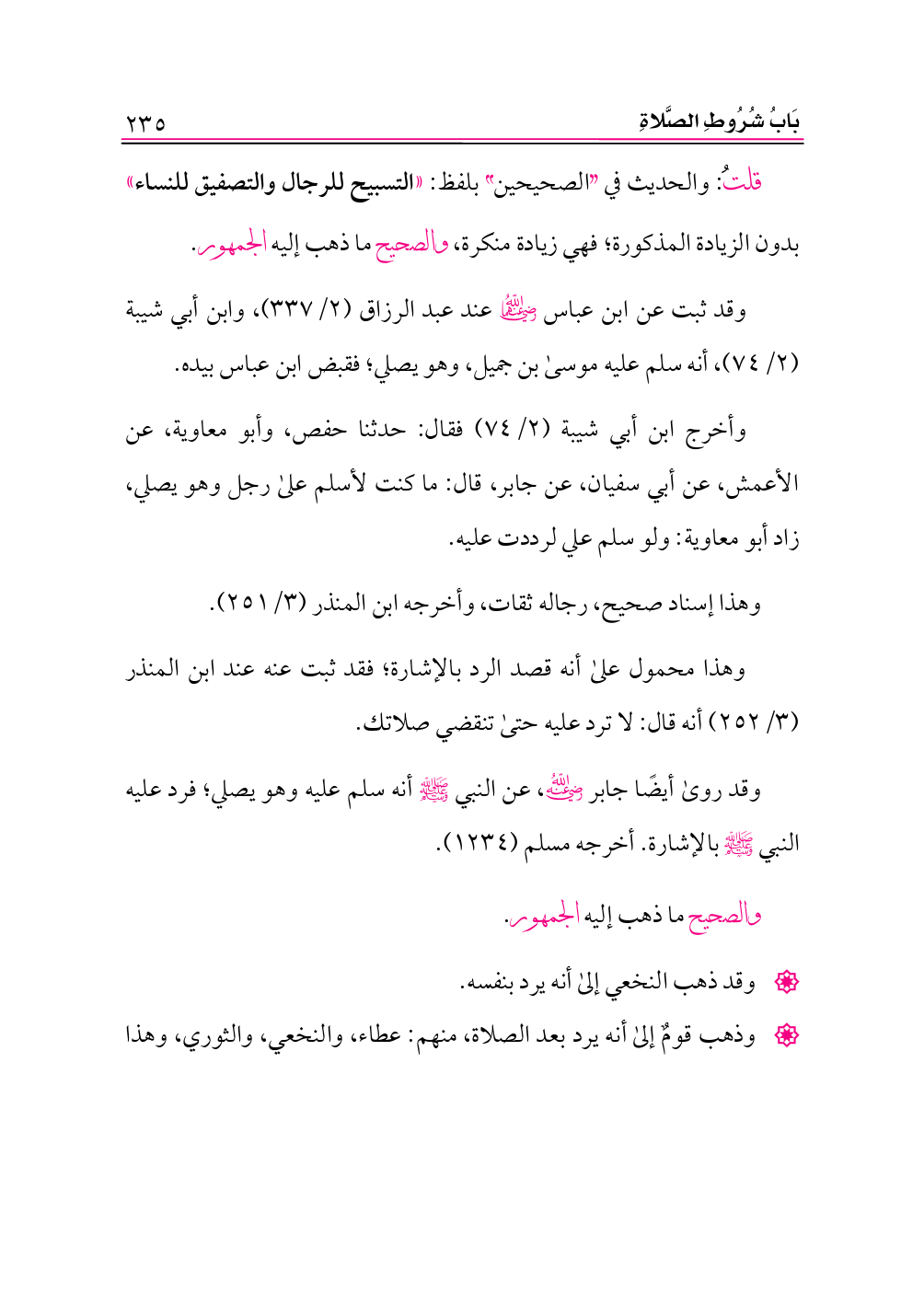 وقد ثبت عن ابن عباس -رضي الله عنهما- عند عبد الرزاق (٢/ ٣٣٧)، وابن أبي شيبة (٢/ ٧٤)، أنه سلم عليه موسى بن جميل، وهو يصلي؛ فقبض ابن عباس بيده.