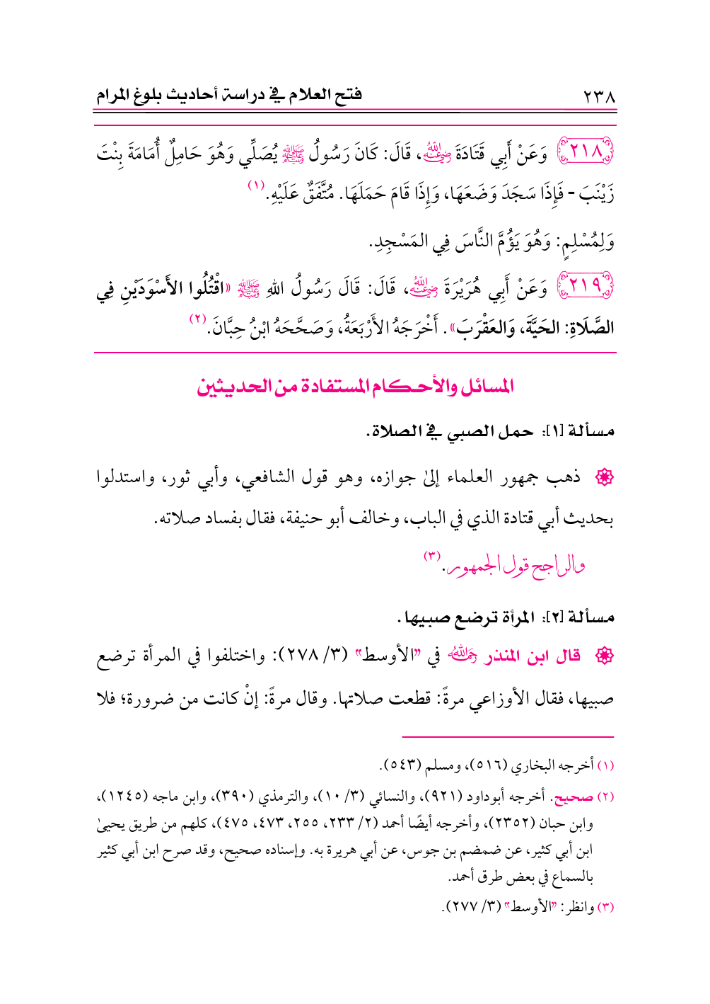 ٢١٩ - وَعَنْ أَبِي هُرَيْرَةَ -رضي الله عنه-، قَالَ: قَالَ رَسُولُ اللهِ - صلى الله عليه وسلم - «اقْتُلُوا الأَسْوَدَيْنِ فِي الصَّلَاةِ: الحَيَّةَ، وَالعَقْرَبَ». أَخْرَجَهُ الأَرْبَعَةُ، وَصَحَّحَهُ ابْنُ حِبَّانَ. (¬٢)