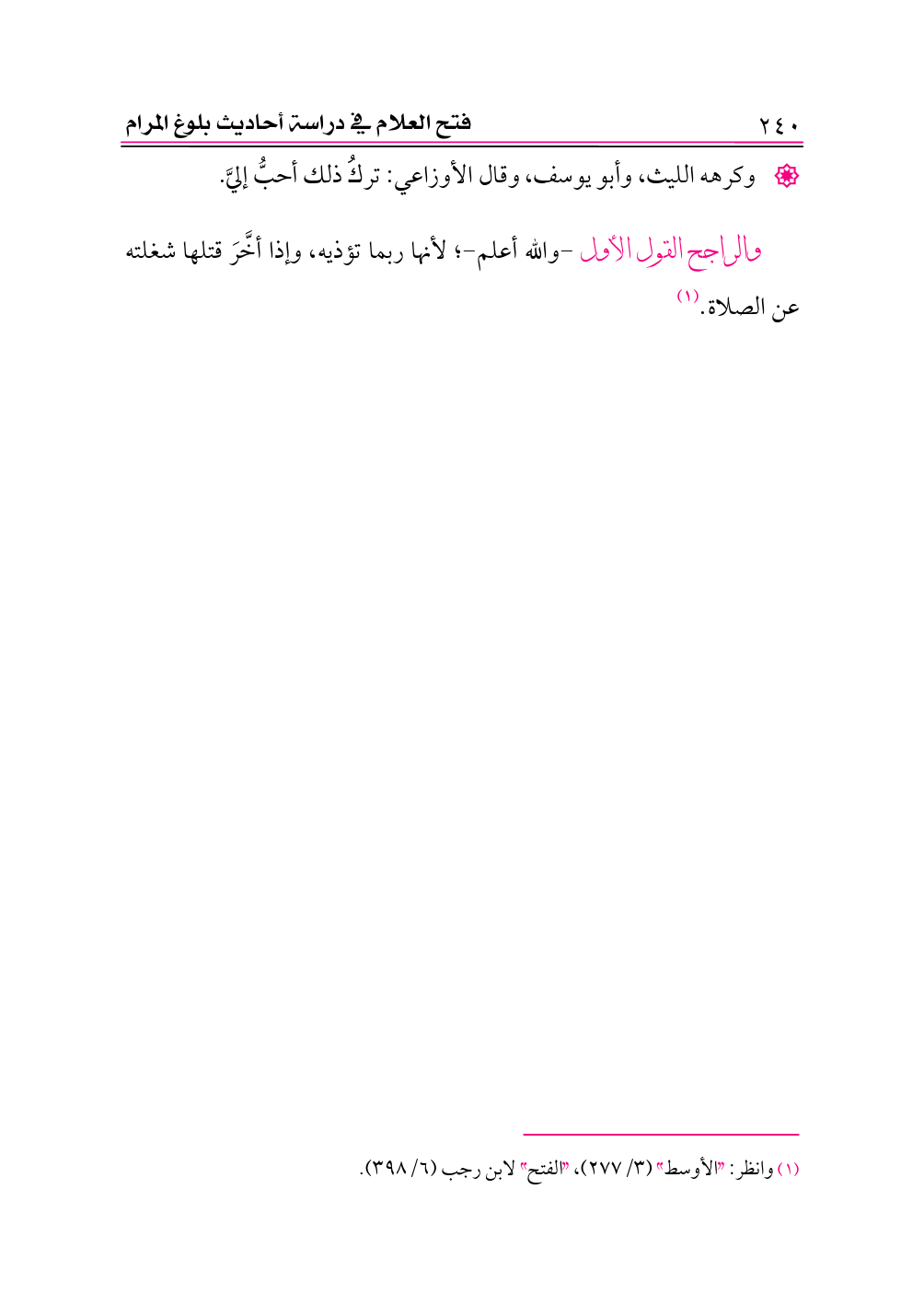 والراجح القول الأول -والله أعلم-؛ لأنها ربما تؤذيه، وإذا أخَّرَ قتلها شغلته عن الصلاة. (¬١)