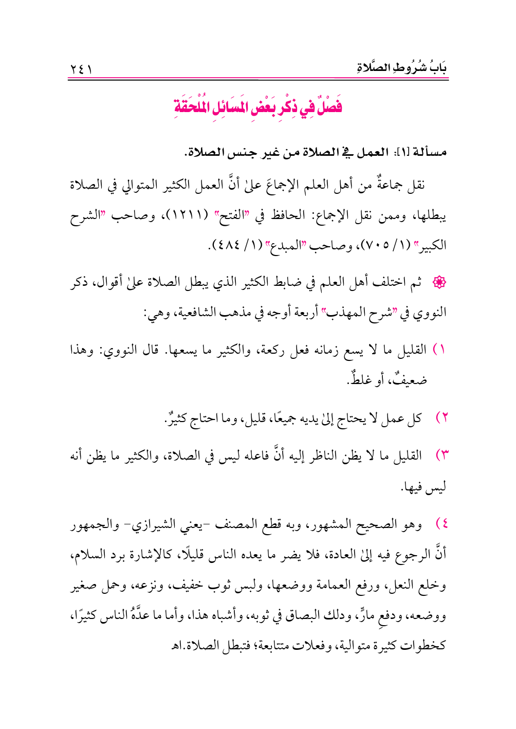 ٤) وهو الصحيح المشهور، وبه قطع المصنف -يعني الشيرازي- والجمهور أنَّ الرجوع فيه إلى العادة، فلا يضر ما يعده الناس قليلًا، كالإشارة برد السلام، وخلع النعل، ورفع العمامة ووضعها، ولبس ثوب خفيف، ونزعه، وحمل صغير ووضعه، ودفعِ مارٍّ، ودلك البصاق في ثوبه، وأشباه هذا، وأما ما عدَّهُ الناس كثيرًا، كخطوات كثيرة متوالية، وفعلات متتابعة؛ فتبطل الصلاة. اهـ