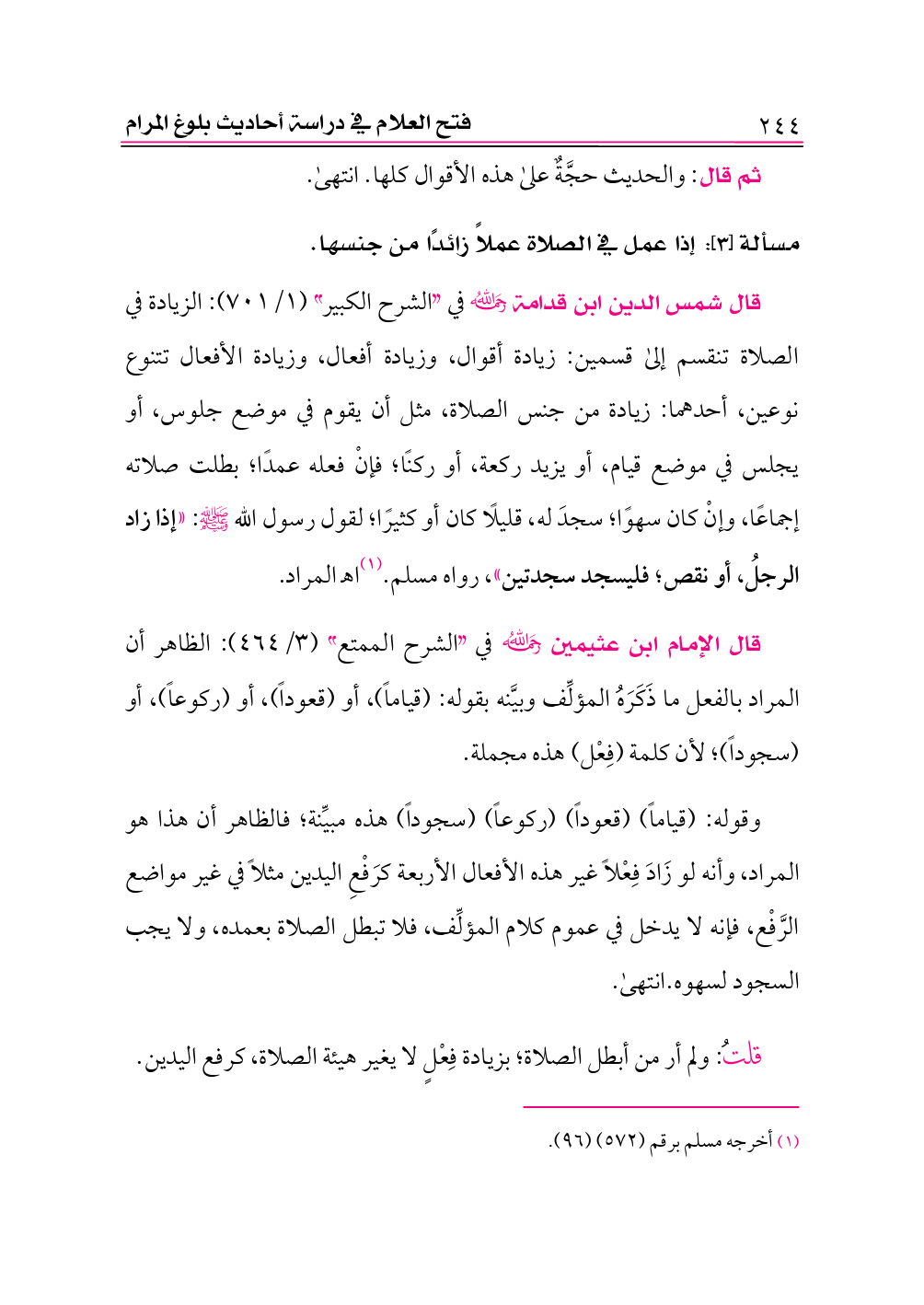 قال شمس الدين ابن قدامة -رحمه الله- في «الشرح الكبير» (١/ ٧٠١): الزيادة في الصلاة تنقسم إلى قسمين: زيادة أقوال، وزيادة أفعال، وزيادة الأفعال تتنوع نوعين، أحدهما: زيادة من جنس الصلاة، مثل أن يقوم في موضع جلوس، أو يجلس في موضع قيام، أو يزيد ركعة، أو ركنًا؛ فإنْ فعله عمدًا؛ بطلت صلاته إجماعًا، وإنْ كان سهوًا؛ سجدَ له، قليلًا كان أو كثيرًا؛ لقول رسول الله - صلى الله عليه وسلم -: «إذا زاد الرجلُ، أو نقص؛ فليسجد سجدتين»، رواه مسلم. (¬١) اهـ المراد.