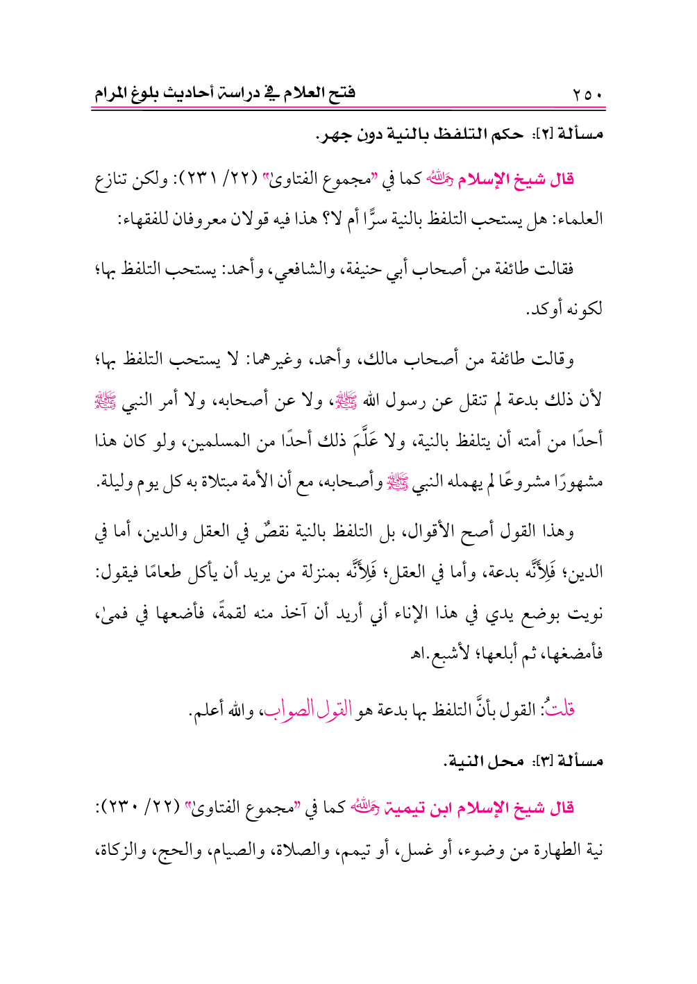 مسألة [٢]: حكم التلفظ بالنية دون جهر.