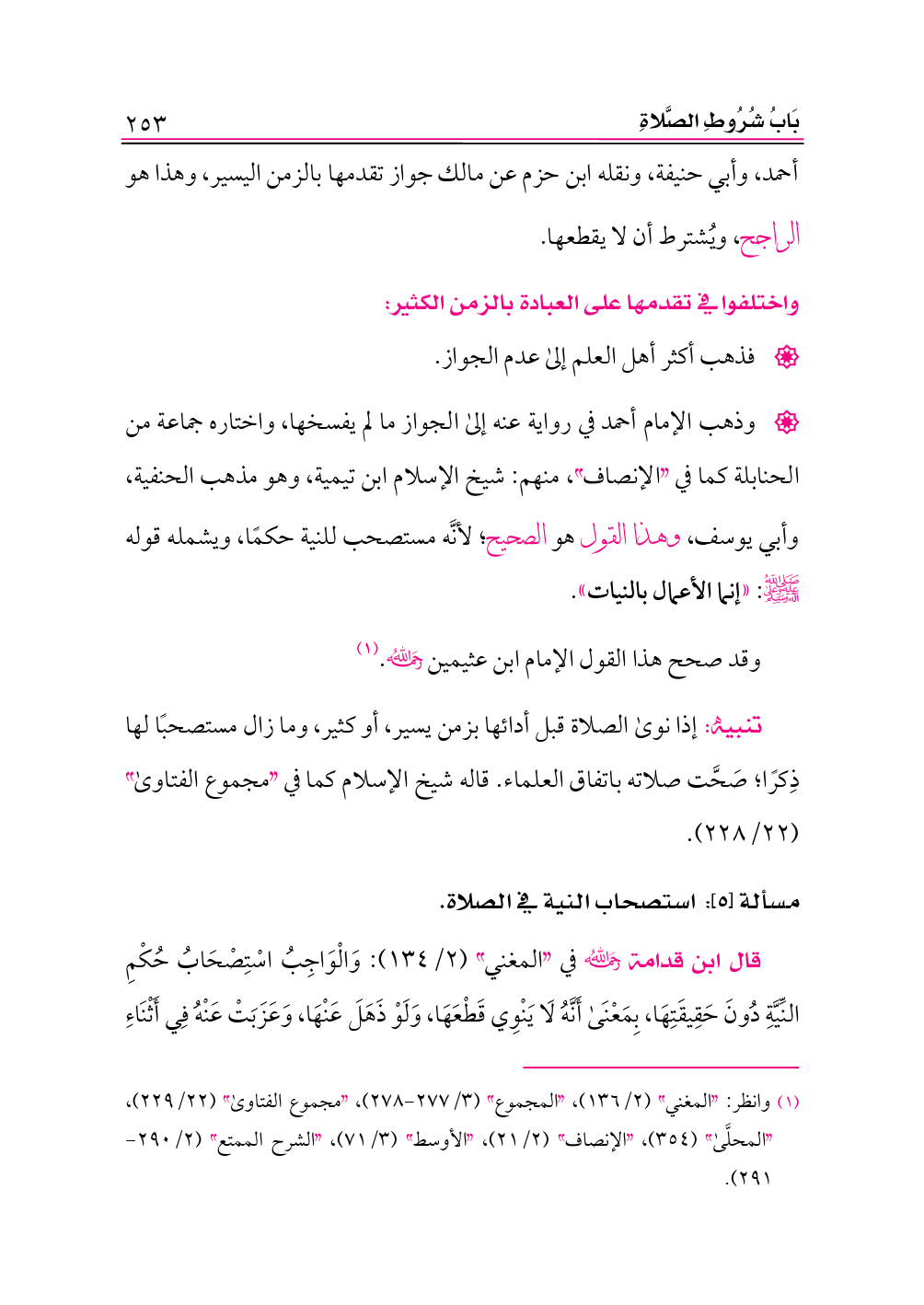 تنبيه: إذا نوى الصلاة قبل أدائها بزمن يسير، أو كثير، وما زال مستصحبًا لها ذِكرًا؛ صَحَّت صلاته باتفاق العلماء. قاله شيخ الإسلام كما في «مجموع الفتاوى» (٢٢/ ٢٢٨).