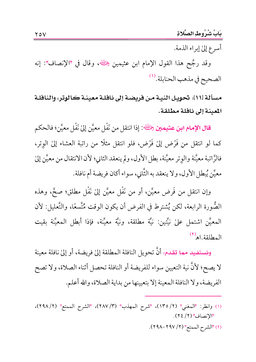 مسألة [١١]: تحويل النية من فريضة إلى نافلة معينة كالوتر، والنافلة المعينة إلى نافلة مطلقة.