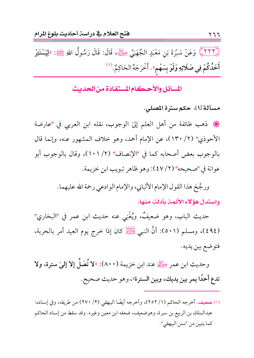 ٢٢٢ - وَعَنْ سَبْرَةَ بْنِ مَعْبَدٍ الجُهَنِيِّ -رضي الله عنه-، قَالَ: قَالَ رَسُولُ اللهِ - صلى الله عليه وسلم -: «لِيَسْتَتِرْ أَحَدُكُمْ فِي صَلَاتِهِ وَلَوْ بِسَهْمٍ». أَخْرَجَهُ الحَاكِمُ. (¬١)