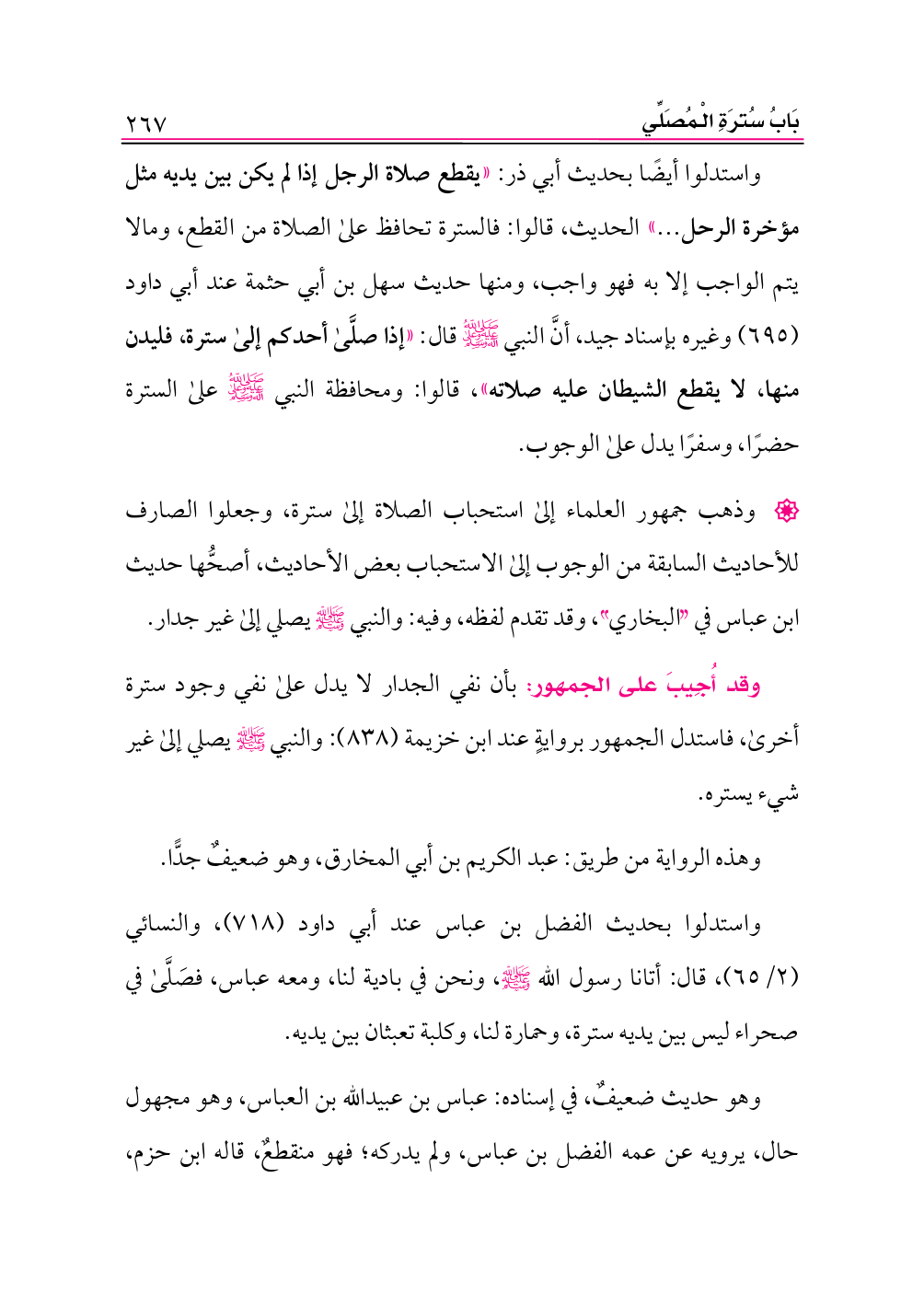 • وذهب جمهور العلماء إلى استحباب الصلاة إلى سترة، وجعلوا الصارف للأحاديث السابقة من الوجوب إلى الاستحباب بعض الأحاديث، أصحُّها حديث ابن عباس في «البخاري»، وقد تقدم لفظه، وفيه: والنبي - صلى الله عليه وسلم - يصلي إلى غير جدار.