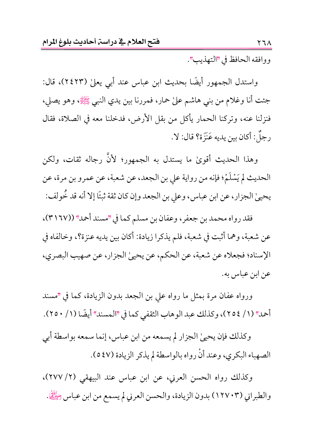 واستدل الجمهور أيضًا بحديث ابن عباس عند أبي يعلى (٢٤٢٣)، قال: جئت أنا وغلام من بني هاشم على حمار، فمررنا بين يدي النبي - صلى الله عليه وسلم -، وهو يصلي، فنزلنا عنه، وتركنا الحمار يأكل من بقل الأرض، فدخلنا معه في الصلاة، فقال رجلٌ: أكان بين يديه عَنَزَة؟ قال: لا.