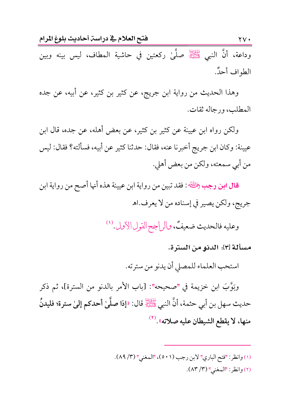 وبَوَّبَ ابن خزيمة في «صحيحه»: [باب الأمر بالدنو من السترة]، ثم ذكر حديث سهل بن أبي حثمة، أنَّ النبي -صلى الله عليه وعلى آله وسلم- قال: «إذا صلَّى أحدكم إلى سترة؛ فليدنُ منها، لا يقطع الشيطان عليه صلاته». (¬٢)