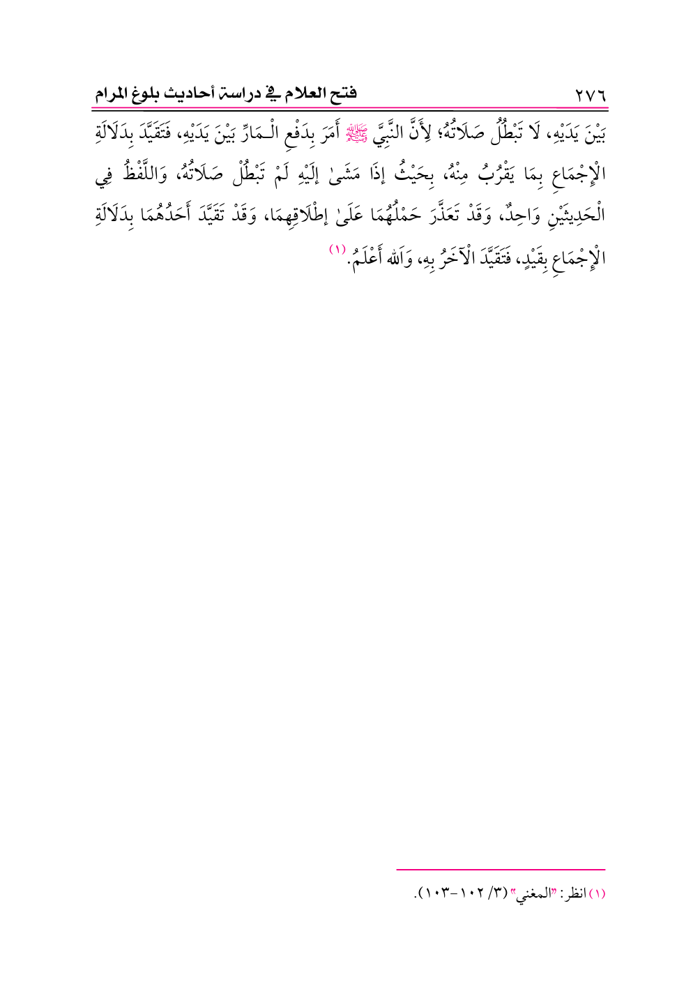 بَيْنَ يَدَيْهِ، لَا تَبْطُلُ صَلَاتُهُ؛ لِأَنَّ النَّبِيَّ - صلى الله عليه وسلم - أَمَرَ بِدَفْعِ الْمَارِّ بَيْنَ يَدَيْهِ، فَتَقَيَّدَ بِدَلَالَةِ الْإِجْمَاعِ بِمَا يَقْرُبُ مِنْهُ، بِحَيْثُ إذَا مَشَى إلَيْهِ لَمْ تَبْطُلْ صَلَاتُهُ، وَاللَّفْظُ فِي الْحَدِيثَيْنِ وَاحِدٌ، وَقَدْ تَعَذَّرَ حَمْلُهُمَا عَلَى إطْلَاقِهِمَا، وَقَدْ تَقَيَّدَ أَحَدُهُمَا بِدَلَالَةِ الْإِجْمَاعِ بِقَيْدٍ، فَتَقَيَّدَ الْآخَرُ بِهِ، وَاَلله أَعْلَمُ. (¬١)