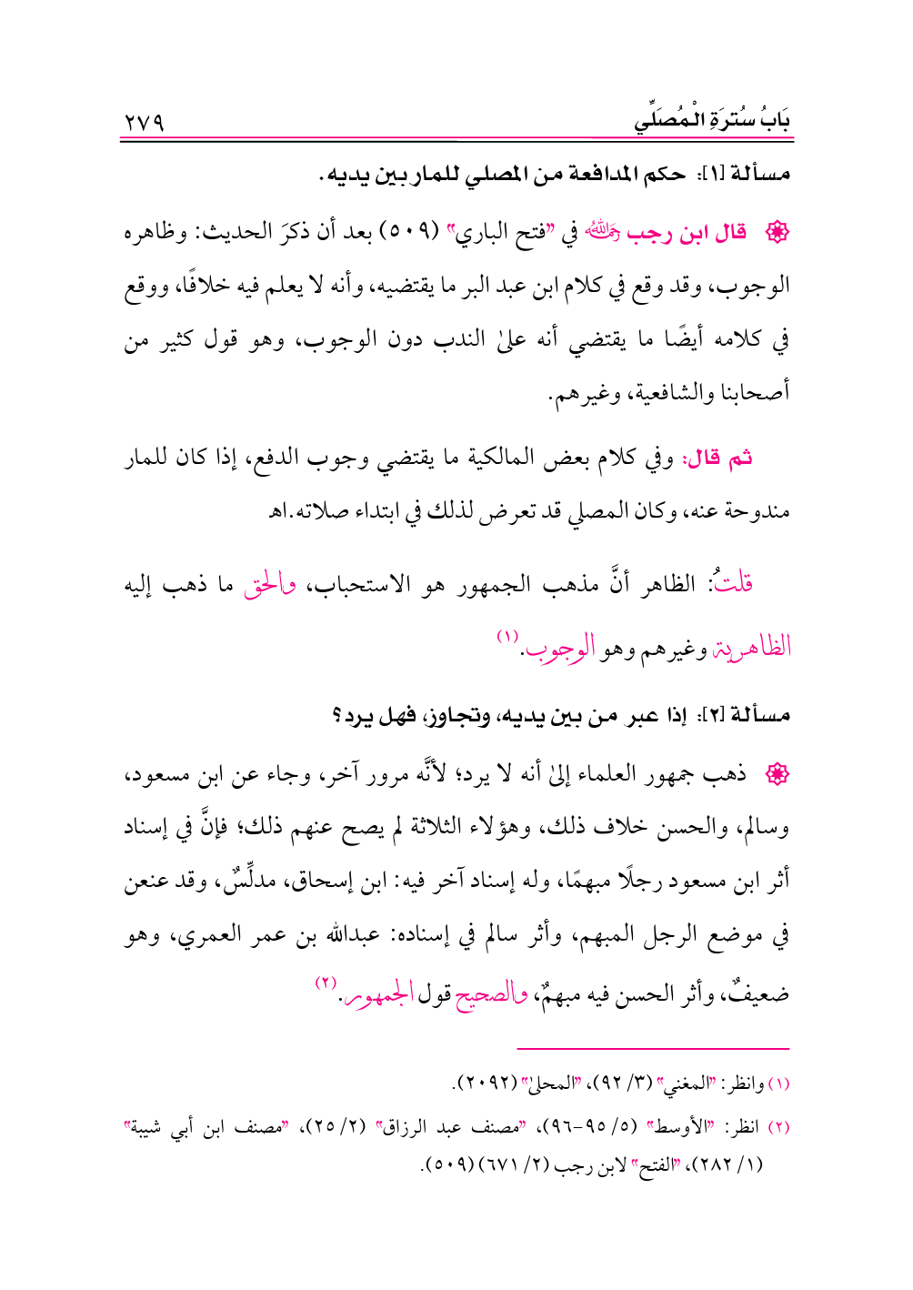 مسألة [١]: حكم المدافعة من المصلي للمار بين يديه.
