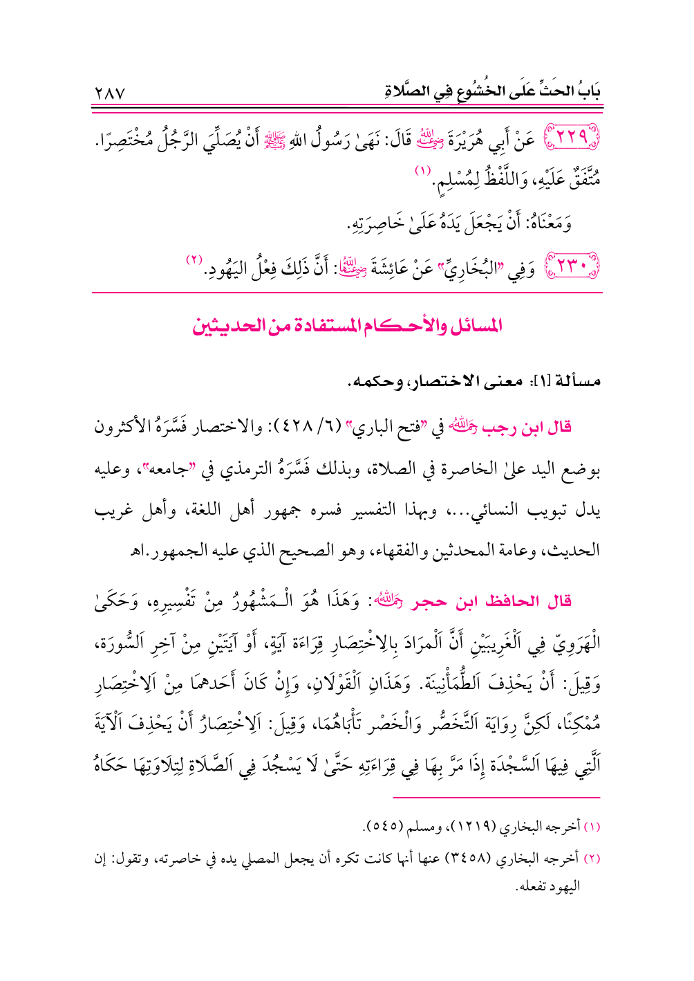 ٢٢٩ - عَنْ أَبِي هُرَيْرَةَ -رضي الله عنه- قَالَ: نَهَى رَسُولُ اللهِ - صلى الله عليه وسلم - أَنْ يُصَلِّيَ الرَّجُلُ مُخْتَصِرًا. مُتَّفَقٌ عَلَيْهِ، وَاللَّفْظُ لِمُسْلِمٍ. (¬١)