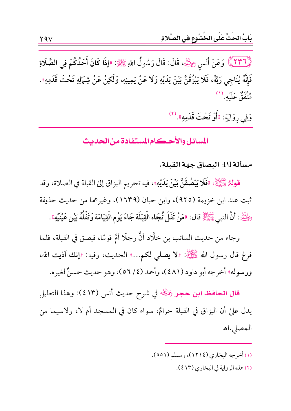 ٢٣٦ - وَعَنْ أَنَسٍ -رضي الله عنه-، قَالَ: قَالَ رَسُولُ اللهِ - صلى الله عليه وسلم -: «إذَا كَانَ أَحَدُكُمْ فِي الصَّلَاةِ فَإِنَّهُ يُنَاجِي رَبَّهُ، فَلَا يَبْزُقَنَّ بَيْنَ يَدَيْهِ وَلَا عَنْ يَمِينِهِ، وَلَكِنْ عَنْ شِمَالِهِ تَحْتَ قَدَمِهِ». مُتَّفَقٌ عَلَيْهِ. (¬١)