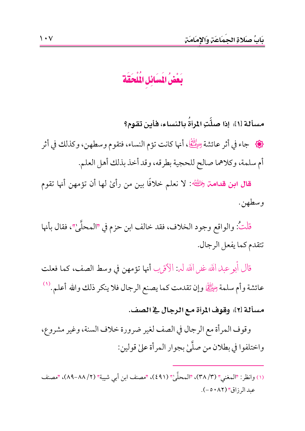 مسألة [٣]: صلاة المرأة منفردة خلف صف النساء في جماعة النساء.