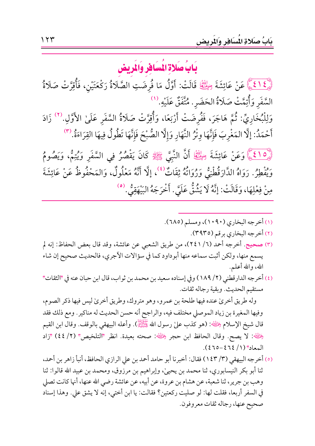 ٢) حديث ابن عباس -رضي الله عنهما- في مسلم (٦٨٧)، قال: فرض الله الصلاة على لسان نبيه - صلى الله عليه وسلم - صلاة الحضر أربعًا، وصلاة السفر ركعتين، وصلاة الخوف ركعة.