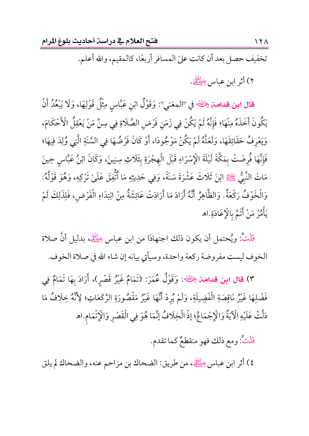 ٥) أثر ابن عمر -رضي الله عنهما-، عند ابن المنذر إسناده ضعيف؛ لأنه من رواية معمر عن قتادة، ولكن أخرجه ابن عبد البر في «التمهيد» (٤/ ٣٧٣)، بإسناد صحيح، ثم قال: الكفر ها هنا كفر النعمة، وليس بكفر يَنْقُل عن المِلَّة، كأنه قال: كفرٌ لنعمة التأسي التي أنعم الله على عباده بالنبي - صلى الله عليه وسلم -، ففيه الأسوة الحسنة في قبول رخصته، كما في امتثال عزيمته - صلى الله عليه وسلم -.اهـ