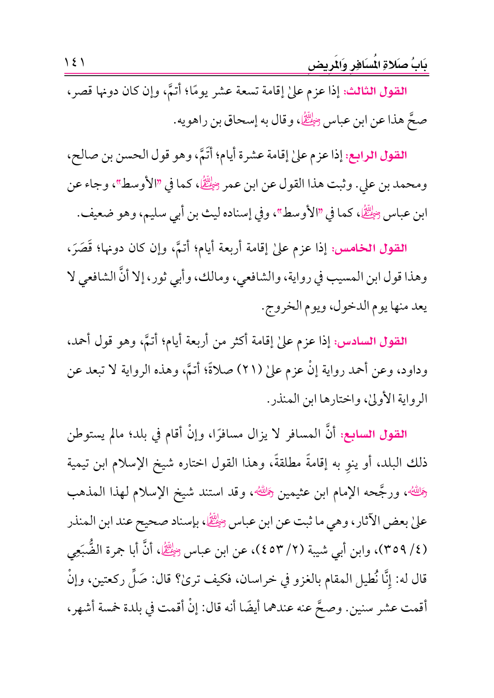 وثبت عن سعد بن أبي وقاص أنه أقام بِعُمان شهرين يقصر الصلاة، أخرجه أيضًا ابن المنذر، وابن أبي شيبة، وثبت عن عبد الرحمن بن سمرة أنه أقام بكابل شتوة، أو شتوتين، يصلي ركعتين. أخرجه ابن أبي شيبة (٢/ ٤٥٤)، وثبت عن ابن عمر -رضي الله عنهما-، أنه أقام بأذربيجان ستة أشهر يقصر الصلاة، حبسه الثلج. أخرجه البيهقي.