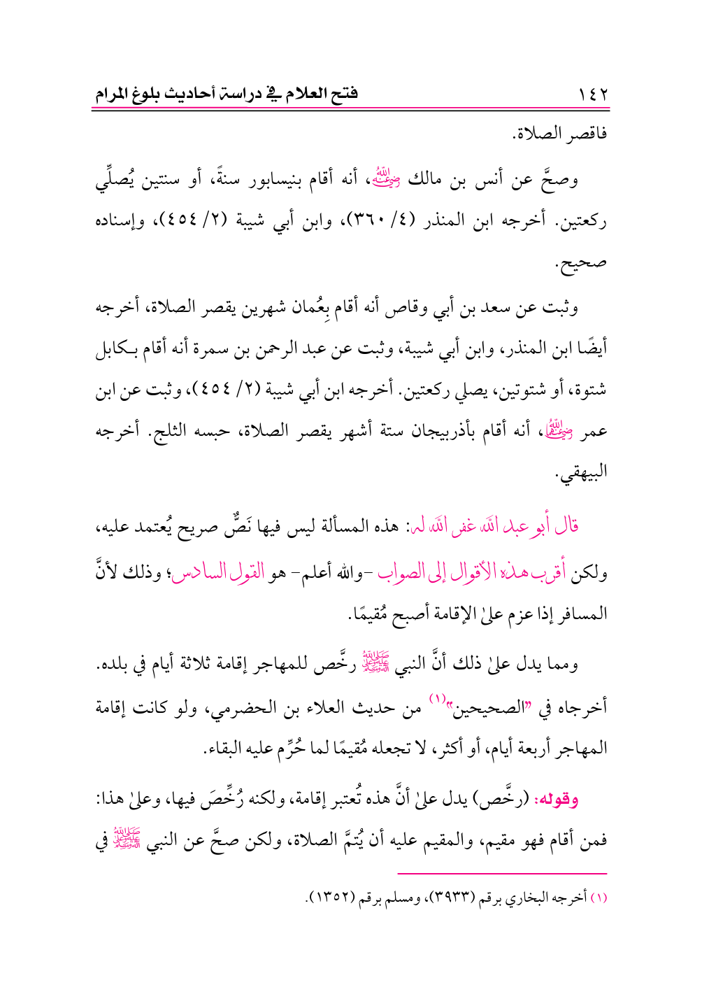 وأما القائلون بتحديد عشرة أيام؛ فحجتهم حديث أنس الذي في الباب، وهو في «الصحيحين»، وفيه زيادة: (قلت لأنس: كم أقمتم بها؟ قال: عشرًا)، لكن قال الإمام أحمد، وغيره: ليس لحديث أنس وجه؛ إلا أنه حسب أيام إقامته - صلى الله عليه وسلم - في حجته منذ دخل مكة إلى أن خرج منها، لا وجه له إلا هذا.
