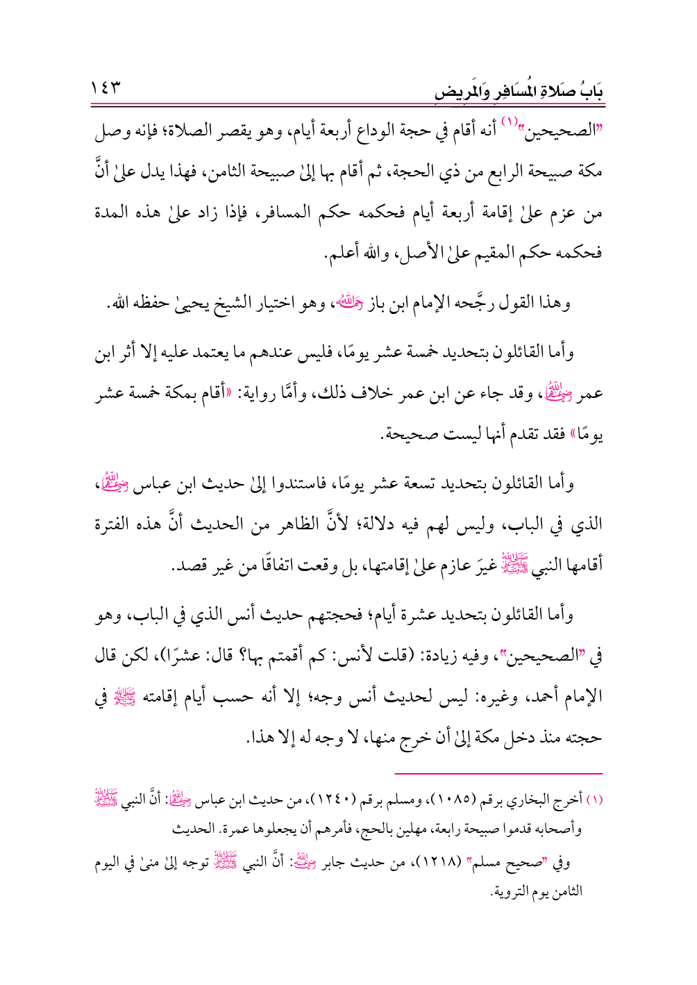 وأما الآثار المذكورة؛ فقد جاء عن ابن عباس -رضي الله عنهما-، التحديد بتسعة عشر يومًا كما في «البخاري»، وجاء عن ابن عمر -رضي الله عنهما-، التحديد باثني عشر يومًا، فهذا يدل على أنَّ الآثار المذكورة عنهما ليس المراد بها أنهم عزموا على إقامة تلك المدة، بل ذلك في حقِّ من لم يعزم على الإقامة.
