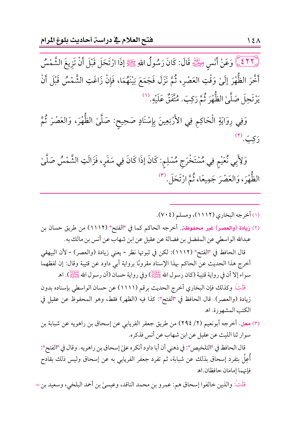 ٤٢٣ - وَعَنْ مُعَاذٍ -رضي الله عنه- قَالَ: خَرَجْنَا مَعَ النَّبِيِّ - صلى الله عليه وسلم - فِي غَزْوَةِ تَبُوكَ، فَكَانَ يُصَلِّي الظُّهْرَ، وَالعَصْرَ جَمِيعًا، وَالمَغْرِبَ، وَالعِشَاءَ جَمِيعًا. رَوَاهُ مُسْلِمٌ. (¬١)