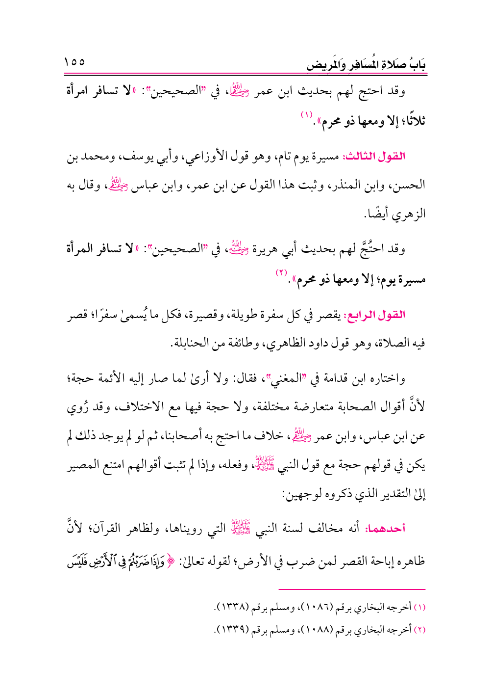 عَلَيْكُمْ جُنَاحٌ أَنْ تَقْصُرُوا مِنَ الصَّلَاةِ}، وقول النبي -صلى الله عليه وعلى آله وسلم-: «يمسح المسافر ثلاثة أيام»، جاء لبيان أكثر مدة المسح؛ فلا يصح الاحتجاج به هاهنا، وعلى أنه يمكنه قطع المسافة القصيرة في ثلاثة أيام، وقد سمَّاه النبي -صلى الله عليه وعلى آله وسلم- سفرًا، فقال: «لا يحل لامرأة تؤمن بالله واليوم الآخر أن تسافر مسيرة يوم؛ إلا مع ذي محرم».
