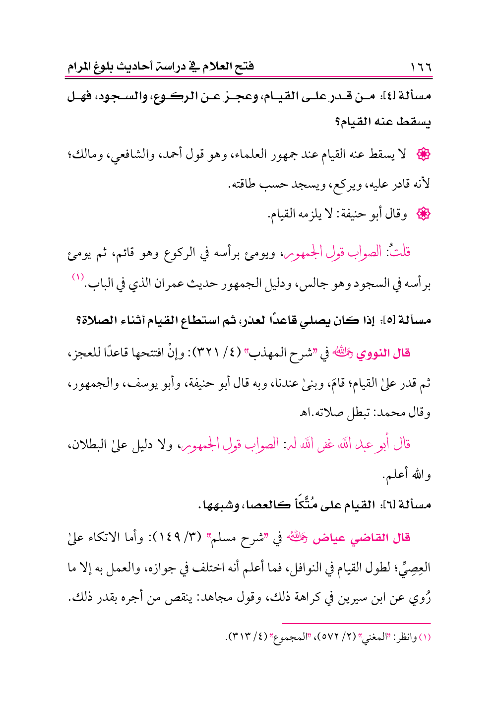• واختلف فيه في الفرائض لغير ضرورة، فمذهب مالك، وجمهور العلماء أنه لا يجوز، وأنه لا يجزئ من القيام، ومن اعتمد على عصي، أو حائط اعتمادًا لو زال سقط؛ فسدت صلاته، وكأنه لم يقم فيها، وأجاز ذلك جماعة من الصحابة، والسلف، منهم: أبو سعيد الخدري، وأبو ذر، وغيرهم. وأما الضرورة، وعند العجز عن القيام؛ فيجوز، وهو أولى من الصلاة جالسًا. قاله مالك وغيره. انتهى.