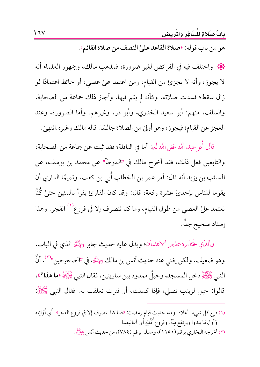 قلتُ: وظاهر نقل القاضي عياض أنَّ مالكًا لا يقول بوجوب الاعتماد على العصا إذا كان قادرًا على القيام بها.