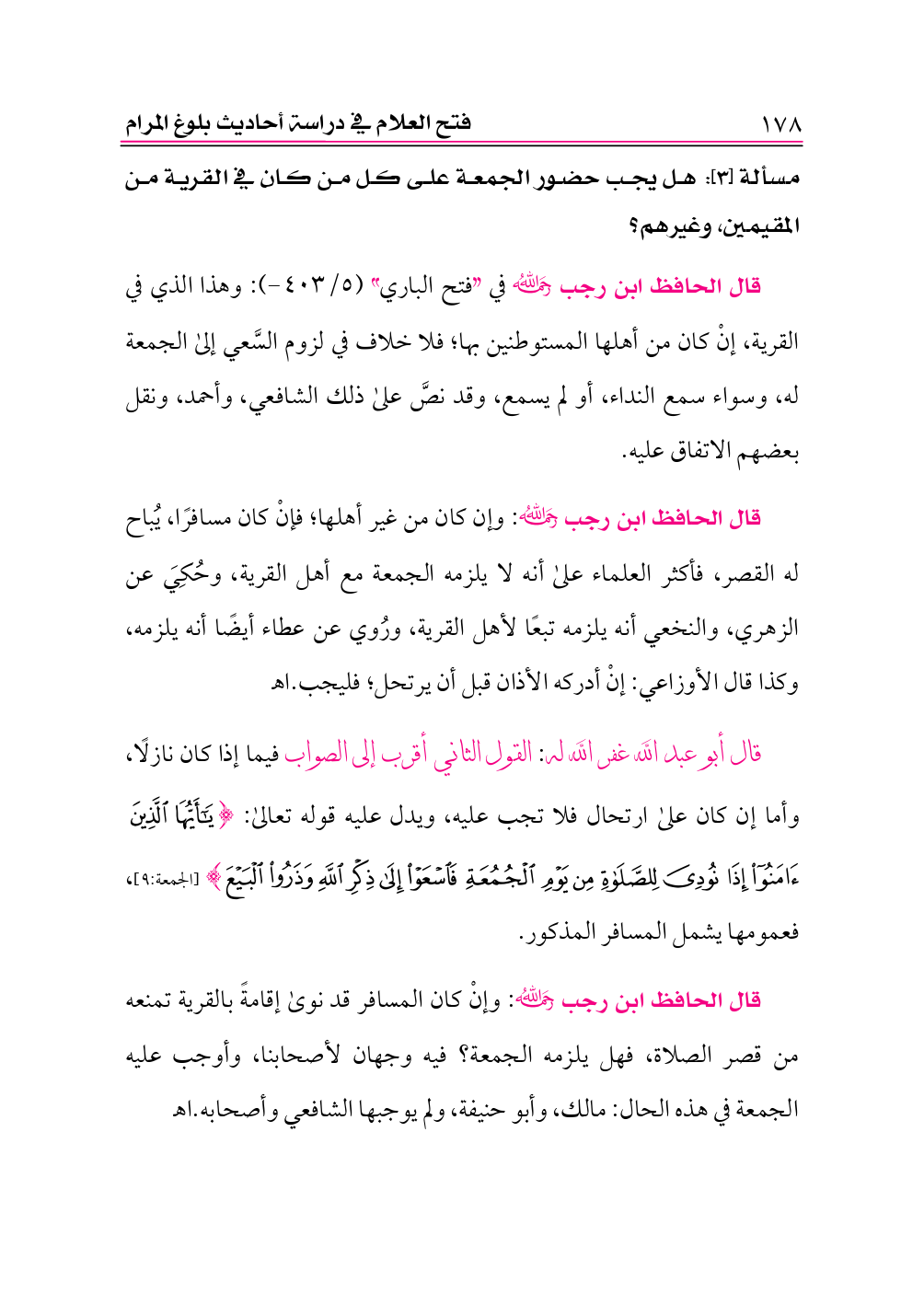 • قال الحافظ ابن رجب -رحمه الله- في «الفتح» (٥/ ٤٠٤): هذا مما اختلف فيه العلماء، فقالت طائفةٌ: لا تلزم من كان خارج المصر، أو القرية الجمعة مع أهله بحالٍ، إذا كان بينهم وبين المصر فرجة، ولو كانوا من ربض المصر. وهذا قول الثوري، وأبي حنيفة وأصحابه، إلحاقًا لهم بأهل القرى؛ فإنَّ الجمعة لا تُقام عندهم في القرى. وقال أكثر أهل العلم: تلزمهم الجمعة مع أهل المصر، أو القرية، مع القرب دون البعد. ثم اختلفوا في حد ذلك: