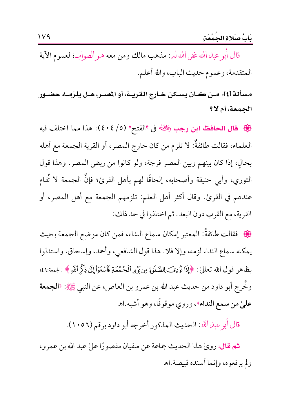 قال: وقالت طائفة: تجب الجمعة على من بينه وبينها أربعة أميال، ورُوي عن ابن المنكدر، والزهري، وعكرمة، وربيعة.
