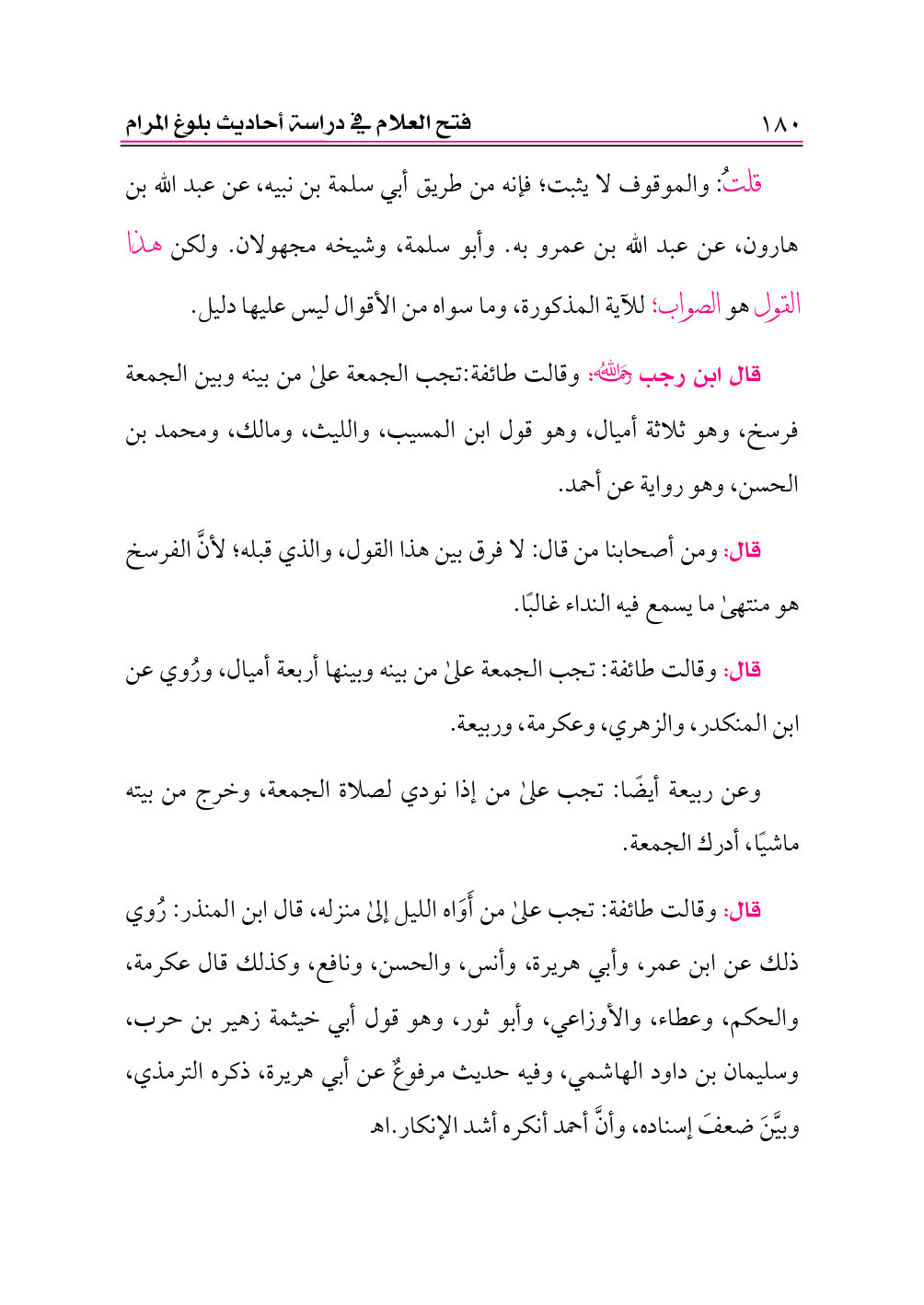 قال أبو عبد الله: وفي المسألة أقوال أخرى، والتي ذكرناها هي الأشهر، والصواب -فيما يظهر لي- هو قول ربيعة: تجب على من إذا نودي لصلاة الجمعة، وخرج من بيته ماشيًا، أدرك الجمعة. لأن الله عز وجل لم يلزم الناس بالسعي للجمعة؛ إلا عند سماع النداء، قال تعالى: {يَاأَيُّهَا الَّذِينَ آمَنُوا إِذَا نُودِيَ لِلصَّلَاةِ مِنْ يَوْمِ الْجُمُعَةِ فَاسْعَوْا إِلَى ذِكْرِ اللَّهِ وَذَرُوا الْبَيْعَ} [الجمعة:٩]، فإذا كان لا يدرك الجمعة بعد سماع النداء؛ فكيف يلزم بحضورها. (¬١)
