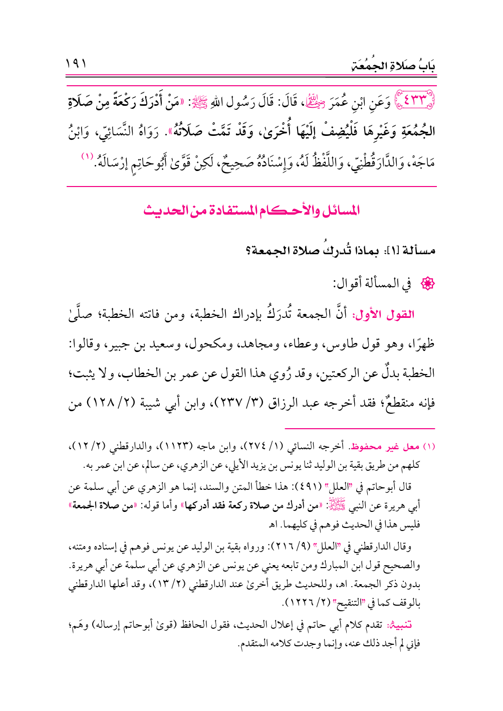 القول الثالث: أنَّ الجمعة تُدركُ بإدراك ركعة، وهو قول أكثر العلماء، منهم: الحسن، والنخعي، والزهري، والأوزاعي، والليث، والثوري، ومالك، والشافعي، وأحمد، وإسحاق، وقد استدل هؤلاء بحديث الباب، وبعموم حديث أبي هريرة في «الصحيحين»: «من أدرك ركعة من الصلاة؛ فقد أدرك الصلاة»، وقد صحَّ هذا القول عن جماعة من الصحابة، وهم: ابن عمر، وابن مسعود، وأنس -رضي الله عنهم-، ولا يُعلم لهم مخالف من الصحابة.