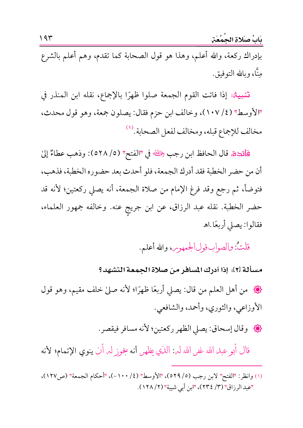 • وقال محمد بن الحسن، وزفر: إن خاف فوات الجمعة؛ صلى الجمعة. (¬٢)
