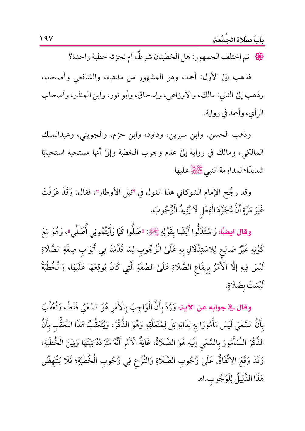 وقال ابن حزم -رحمه الله- في «المحلَّى» (٥٢٧): ومن لهذا الْمُقْدِم أن الله تعالى أراد بالذكر المذكور فيها الخطبة، بل أول الآية، وآخرها يكذبان ظنَّه الفاسد؛ لأنَّ الله تعالى إنما قال: {إِذَا نُودِيَ لِلصَّلَاةِ مِنْ يَوْمِ الْجُمُعَةِ فَاسْعَوْا إِلَى ذِكْرِ اللَّهِ}، ثم قال عز وجل: {فَإِذَا قُضِيَتِ الصَّلَاةُ فَانْتَشِرُوا فِي الْأَرْضِ وَابْتَغُوا مِنْ فَضْلِ اللَّهِ وَاذْكُرُوا اللَّهَ كَثِيرًا} [الجمعة:١٠]، فصح أن الله إنما افترض السعي إلى الصلاة إذا نودي لها، وأمر إذا قضيت بالانتشار وذكره كثيرًا؛ فصح يقينا أن الذكر المأمور بالسعي له هو الصلاة، وذكر الله تعالى فيها بالتكبير، والتسبيح، والتمجيد، والقراءة، والتشهد لا غير ذلك. اهـ.
