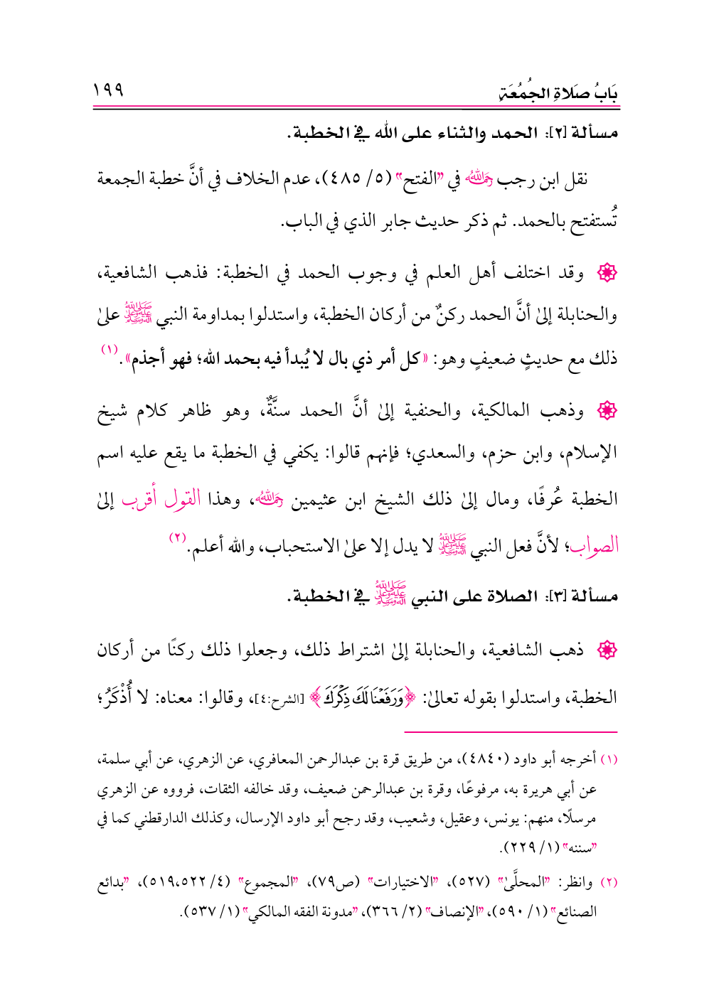 (¬٢) وانظر: «خطبة الجمعة» (ص ١٣٤ - ) للحجيلان، «الإنصاف» (٢/ ٣٦٧)، «المجموع» (٤/ ٥٢٠ - )، «البيان» (٢/ ٥٧١ - ٥٧٣).