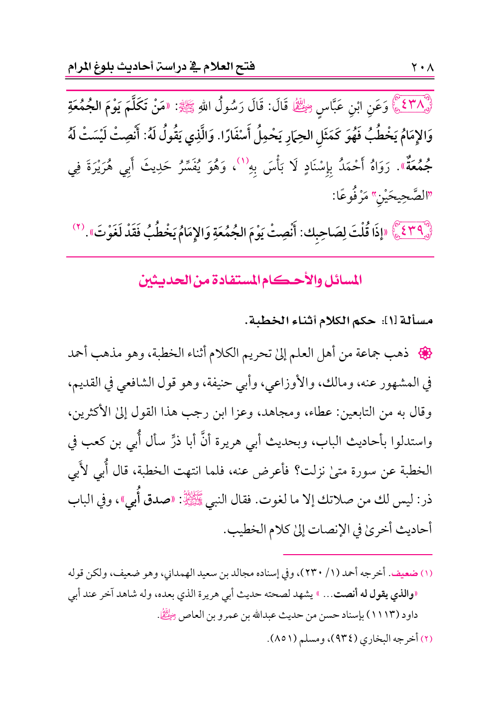 وقد أجاب أصحاب القول الأول عن هذه الأحاديث بأنها مخصوصة بالكلام مع الخطيب للحاجة جمعًا بين الأدلة، والقول الأول هو الصواب، والله أعلم. (¬١)