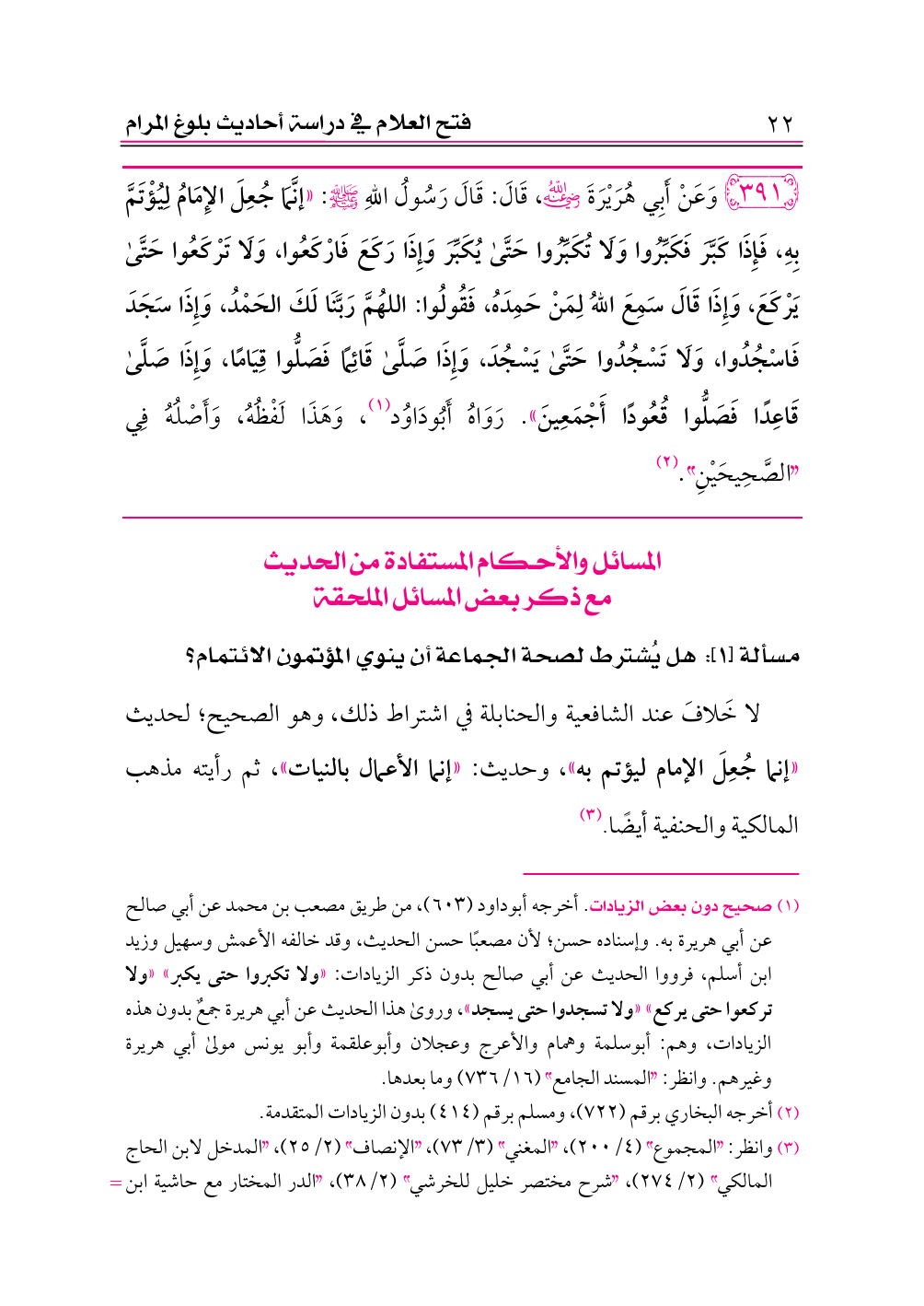 (¬١) صحيح دون بعض الزيادات. أخرجه أبوداود (٦٠٣)، من طريق مصعب بن محمد عن أبي صالح عن أبي هريرة به. وإسناده حسن؛ لأن مصعبًا حسن الحديث، وقد خالفه الأعمش وسهيل وزيد ابن أسلم، فرووا الحديث عن أبي صالح بدون ذكر الزيادات: «ولا تكبروا حتى يكبر» «ولا تركعوا حتى يركع» «ولا تسجدوا حتى يسجد»، وروى هذا الحديث عن أبي هريرة جمعٌ بدون هذه الزيادات، وهم: أبوسلمة وهمام والأعرج وعجلان وأبوعلقمة وأبو يونس مولى أبي هريرة وغيرهم. وانظر: «المسند الجامع» (١٦/ ٧٣٦) وما بعدها.